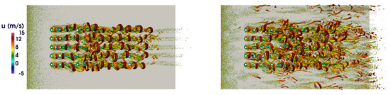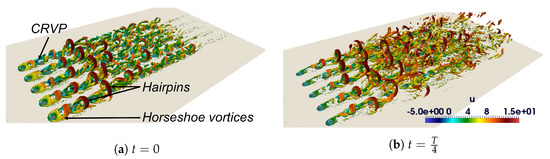 A Q-criterion isosurface at the instant corresponding to the ejection mid-period is provided in Figure 12, for the lab-scale configuration without and with upstream turbulence. Similar flow structures are observed in both cases. However, in the presence of upstream turbulence, the hairpins are asymmetric and more bent-shaped than without upstream turbulence. This result is in agreement with the observations of Wen and Tang [16]. With a turbulent inlet, the hairpins lose their coherence faster and seem to remain lower in the boundary layer, implying that jets are more folded by the upstream flow.