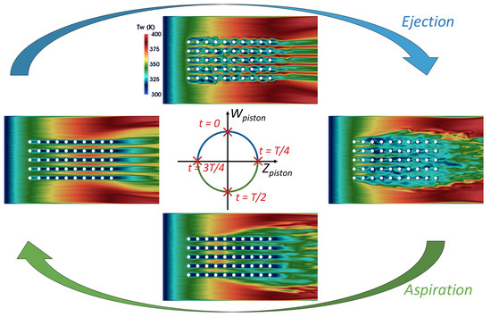 To conclude this thermal analysis, the plate temperature averaged over five periods of the piston motion is given in Figure 9. The observations made in the analysis of the instantaneous field are retrieved with the development of a stationary boundary layer from the inlet to the perforations, the competition of the blockage effect during the ejection and aspiration phases of the first row of synthetic jets, the predominance of the aspiration phase in the jet wakes and the mixing in between the jets.