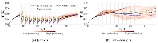 To illustrate the unsteadiness of the the flow, Figure 8 presents the different values that can be taken by the temperature through several periods of the piston motion along two axes: the jet axis and the in-between-jets axis. The time-averaged values are provided for the whole period (“global mean”) as well as the ejection mid-period (“ejection mean”) and the aspiration mid-period (“suction mean”). To complement this statistical view of the profiles, PDF distributions are obtained by recording, for each position , all of the temperature values that can be reached over time. The sampling chosen here is 40 savings per period T. Envelopes are coloured relatively to the PDF for the symmetry plane and between the jets: the darker the colour, the higher the probability to reach this temperature value. For both axes, the distribution is characterised by a very narrow range of possible temperature values upstream of the perforated zone, which is coherent with the steady development of a thermal boundary layer along a flat plate. Along the jet axis (Figure 8a), the range of temperature values is much wider. After a peak around 370 K around the first perforation, the maximum temperature decreases and tends to plateau around 340 K. After the third perforation, a pattern appears between each of the perforations. Further information provided by this figure is the difference between the aspiration and the ejection mid-periods. Indeed, the lower part of the temperature envelope, under the global mean value, can be attributed to the suction phase while the upper part is caused by the ejection. It appears that the difference between the upper part of the temperature enveloppe and the ejection mean value is larger than the difference between the lower part of the temperature envelope and the suction mean value. This can be compared with the previous analysis: in the aspiration, the flow is completely driven by the suction while the boundary layer is stabilised. The flow is cooled down efficiently and the temperature values remain close to the mean value; a narrow range of values can be observed. This explains why the suction mean value is so close to the minimal value. On the contrary, during the ejection mid-period, the jets generate turbulence and several flow structures that impact the plate. It is thus expected to get a large range of temperatures. Regarding the PDF, two main “paths” can be observed. Each of them matches one of the mid-period means, supporting the hypothesis that these two paths can be attributed to each of the mid-periods. The one at the bottom of the envelope, which corresponds to the suction mid-period, is narrow. If the ejection phase was excluded, this would correspond to a PDF with a small standard deviation. On the contrary, the ejection PDF is broader, corresponding to a larger standard deviation. The flow is stabilised during the aspiration; the thin, new boundary layer after each of the perforations contributes to an efficient cooling of the wall. The heat transfer, as well as the flow dynamics, is totally driven by the suction. On the contrary, during the ejection phase the jets increase the turbulence levels and the different flow structures impact the plate in a more chaotic way. Finally, between the jets (Figure 8b), the temperature range is wider due to the effect of turbulent structures emitted from the synthetic jets. It should be noted that the two mid-period mean temperature profiles seem to be in contradiction with the previous analysis: the aspiration profile reveals higher temperature values than those obtained for the ejection. It was shown that, during the aspiration, the boundary layer between the perforations evolves along the flat plate, leading to an increasing temperature. During the ejection, the plate is impacted by the flow structures, which bring cold flow near the wall, leading to lower temperatures. Therefore, the opposite trend should be expected, with a lower ejection mean temperature than the aspiration one. One explanation for the observed counter-intuitive result is that, due to the latency between the jet formation and their impact on this zone, a delay in heat transfer response can appear. As can be seen in Figure 7 with the temperature field evolution along the whole plate through a period, it takes the whole ejection mid-period for the jets to flow in the zone between the perforations. At the middle of the ejection phase (), the vortices are still not spread enough to reach the axis between the jets and the temperatures are therefore still high. In the same way, it takes the whole suction phase to evacuate all of the flow structures: at the middle of the aspiration (), their impact can still be observed from the fifth perforation row to the end of the plate. The ejection mid-period is hence efficient to decrease the plate temperature, with wall temperatures equal to that observed in the jet axis. However, during the aspiration the thermal boundary layer thickens in a way similar to that of a flat plate, leading to high temperatures at the end of the perforated area. The maximum temperatures observed for this axis are close to that of the flat plate case. Around the first perforations, it is even higher. With the PDF, two similar “paths” can be observed along the first part of the plate, from to . For , no specific path is seen and the standard deviations of both ejection and aspiration are much larger.