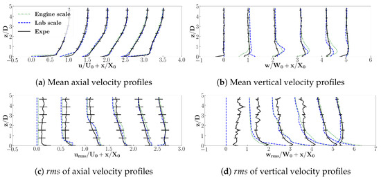 A preliminary validation of the lab-scale configuration with no turbulence injection was presented in a previous study [28]. It confirmed the key role of the mesh adaptation strategy and the validity of the numerical set-up. In the present study, the goal is now to assess the relevance of the similitude methodology that allows the use of the lab-scale configuration in place of a real geometry and operating condition to perform experiments. To do so, velocity profiles corresponding to both lab and engine scales are compared to the experimental data (Figure 10). Recall that these cases correspond to the simulations without turbulence injection at the inlet. The experimental uncertainty, shown by the error bars in the velocity profiles, is equal to 4% for mean velocities and 8% for rms velocities [18]. The provided profiles coincide with the following positions: , , , , and , shown in Figure 1b. To clarify the figures, the dimensionless velocity profiles are shifted with the addition of , where m for axial velocities and m for vertical velocities.