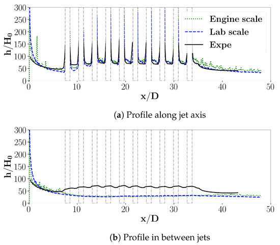 The normalised wall heat transfer coefficent h obtained by LES is compared to the experimental results in Figure 11. Here, h is normalised by , which equals 1 W.m.K for the lab scale and 6.25 W.m.K for the engine scale. The considered axes correspond to those shown in Figure 1b. First, the simulations retrieve the right order of magnitude and both the lab scale and the engine scale present similar results. Some differences from the experimental data are nonetheless present. To begin with, upstream of the perforations, the heat coefficient h profiles present a similar shape for the three data sets, corresponding to a developing boundary layer along a flat plate. The slope is, however, larger for the numerical results than for the experimental data. The perforated area can be divided into two main areas: the jet wakes and the zone between the jets. Along the jet wakes, numerical predictions underestimate the heat transfer coefficient h close to the first perforation whereas it is well reproduced from the second jet row. This observation is linked to the absence of inlet freestream turbulence in the simulation, which seems to be critical for the first row of jets. On the contrary, between the jets, predicted h evolutions differ from the experimental data. These differences are of two kinds and are explained by different factors: (i) The wavy aspect obtained for the experimental data between the perforations is directly due to the experimental set-up. Indeed, the heating system is not totally homogeneous. Since the boundary conditions imposed for the simulations are homogeneous wall heat fluxes, these patterns can not be retrieved by the numerical results and the profiles are smooth. (ii) The numerical results between the perforations are quite far from the mean value of the experimental data wavy part and this difference is still present downstream of the perforations. There, the experimental heating system is way more homogeneous and thus does not explain this difference. Further analyses pointed out the importance of the upstream turbulence, as detailed in the following section.