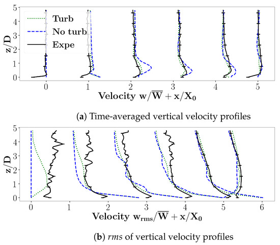 Time-averaged vertical velocity profiles are compared for the lab-scale configuration for both cases with and without upstream turbulence in Figure 13 in the jet axis (in-between jet and axial velocities are not shown for the sake of brevity). These are also compared to the experimental data. The vertical velocity (Figure 13a), which characterises the jets, is better predicted in the turbulent case; without turbulence at the inlet, the jet velocities are overpredicted. Consistent with the Q-criterion analysis, the synthetic jets are more folded in the presence of upstream turbulence. Some differences are observed for the fluctuating velocities (Figure 13b) between the numerical results and experimental data in the upstream part of the plate, before getting closer and even superposed downstream of the jets, where the simulations correctly predict the velocity profiles.