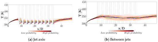 The analysis of the temperature PDF in Figure 15 provides further understanding on how the turbulence role is important for the wall heat transfer. Since both reference and turbulent operating points are based on the same jet parameters, the same trends are found in the temperature PDF. Two main differences can, however, be noted. First, the PDFs for both the jet axis and between the jets are narrower in the turbulent case than in the laminar one, indicating a lower temperature standard deviation. The second point is that higher temperatures can be reached in the reference case than in the turbulent case. This is particularly visible in the jet axis plane between the first and second perforations, where a temperature peak around 360 K is found for the reference case while it reaches only 350 K in the turbulent one. This lower peak is linked to the fact that the upstream turbulence contributes to lower synthetic jets at the first perforation rows and lower hairpins. Such a difference in temperature can also be observed between the jets. For , the maximum temperature reaches around 380 K in the reference case while it does not get higher than 360 K with upstream turbulence. This can be attributed to the development of the hairpins, which were shown to widen in the presence of turbulence, leading to lower temperatures farther from the jets. Moreover, the higher turbulence levels also lead to an increased mixing and therefore lower wall temperatures.