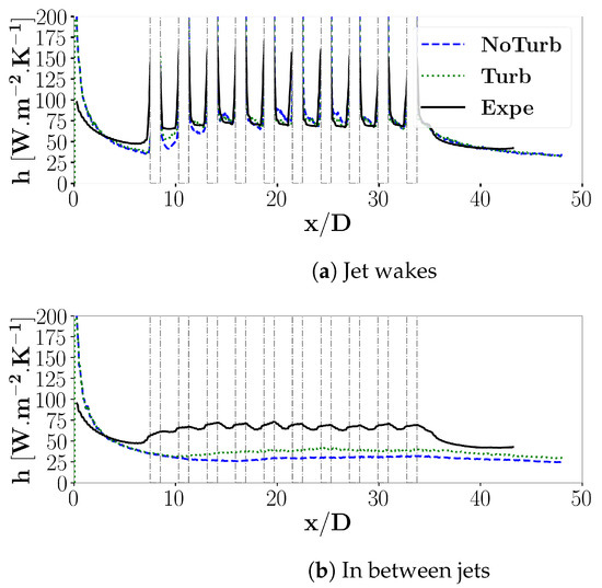 The previous results on wall shear stress and temperature with and without upstream turbulence show that the synthetic jets drive the flow most of the time but upstream turbulence can become preponderant in some specific locations and at specific instants. As a result, the wall heat transfer coefficient h differs with the two inlet flow conditions. Figure 16 compares the heat transfer coefficient along the jet axis (Figure 16a) and between the jets (Figure 16b), for lab-scale simulations with and without upstream turbulence, with the experimental data. On the jet axis, the simulation without upstream turbulence is already really close to the experimental data. This is consistent with the conclusions obtained from the wall shear stress analysis: the synthetic jets drive the flow at this location. However, there is still one difference along the first two perforation rows, where the results are even closer to the experimental data for the turbulent case. The upstream jets are directly bent by the grazing flow, and thus by the upstream turbulence, while the downstream jets are impacted by the upstream jets, which impose their dynamics to the flow. Between the jets, the effect of the upstream turbulence is much more important than for the jet axis. In particular, the heat transfer coefficient gets higher in the turbulent case from the third perforation and remains higher until the end of the plate. This higher value matches that of the experimental data downstream of the perforations, while the simulation without upstream turbulence is characterised by an underpredicted heat transfer coefficient. Here again, this observation is consistent with the wall shear stress analysis: between the jets, the flow behaviour is no longer driven by the synthetic jets but rather by the upstream conditions. It is thus logical to better predict heat transfer at this location with the appropriate numerical upstream conditions.