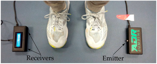 To avoid displacements in the transverse and frontal plane, the jumps were performed on a bounded surface of 29.2 × 42 cm, meaning that the take-off and landing phases were executed completely within the boundaries. At the lateral ends of the jumping surface, the emitter and receiver boxes were positioned so that the center of the boxes were aligned with the phalanges at the time of take-off and landing (Figure 2).
