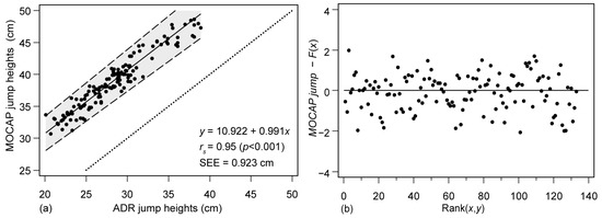 Correlation analysis between the MoCAP system and the ADR jumping photocell through Passing and Bablok regression and residuals plot. (a) The continuous line represents the regression line; the shaded area represents the confidence intervals for 95% of the regression line; the pointed line is the x = y line; rs which represents Spearman’s correlation coefficient; SEE = Standard Error of Estimate; (b) Residuals plot. No trends are discernible; thus, linearity is assumed.