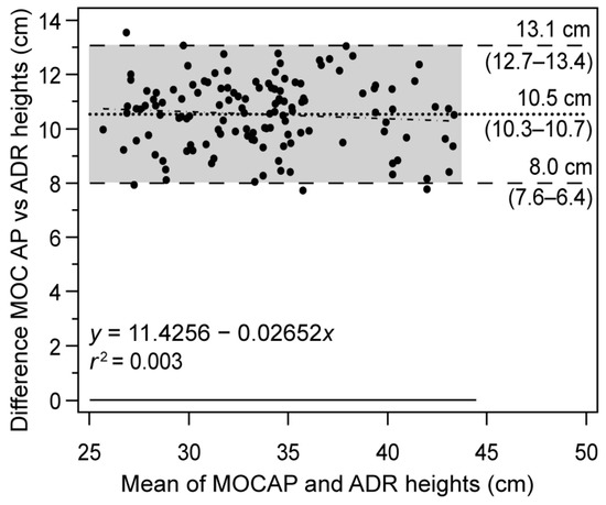 Bland–Altman plots are used to assess the agreement between the height data of the two paired devices, allowing for the visualization of the differences between the two methods, and the extent to which the differences vary depending on the magnitude of the measurement. The limits of agreement (LoA) are defined as the interval within which the differences between the two methods of measurement are expected to fall with 95% confidence. LoA are calculated using the SD of the differences as LoA = ±1.96 × SD and represent the range within which 95% of the observed differences between the two methods of measurement are expected to fall. The maximum allowable differences were calculated from the coefficients of variation (CV) of each method according to the expression (CV2method1 + CV2method2)1/2 [57], interpreting that the methods are not in disagreement if the 95% confidence limits of the upper LoA are below the maximum allowable difference and the lower LoA is above the maximum allowable difference [58].