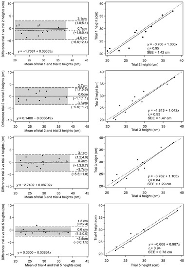 On the other hand, the proportionality of the error was negligible as the slopes observed for the fit lines varied from 3.10−3 to 0.08. The observation of regression plots showed very strong and near perfect linear relationships between consecutive trials (0.84–0.95), with slopes very near unity and intercepts ranging from −0.6 to −3.7 cm.