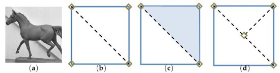 This process is shown in Figure 1, where an initial image, Figure 1a, is approximated by its four vertices. The interpolation is performed using the information about the location of the vertices and their grey values. If the original image is presented by and its approximation is then an error can be defined as . If satisfies for every image element with given error threshold parameter , the representation with triangles is considered to be sufficiently good.