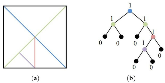 The process of creating a binary tree structure is shown in Figure 2. In Figure 2a, the process is shown for a square image and, in Figure 2b, the resulting binary tree is generated. First, the image is divided by its main diagonal, then the process is repeated for the newly created triangles. To compress the grey values in all vertices, a zigzag traversal of the sparse image is performed and stored in the grey value stream. The pseudocode can be seen in the following text below: