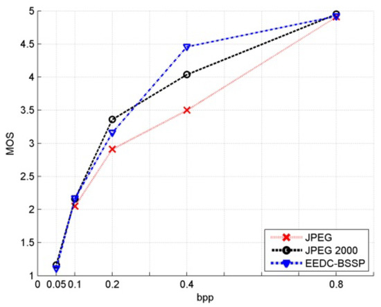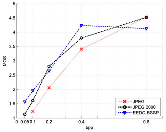 For the image pills, JPEG 2000 was generally rated as the best compression method, but had a lower value than EEDC-BSSP at 0.2 bpp (seen as a “drop” at 0.2 bpp in Figure 21). Interestingly, JPEG was ranked better than EEDC-BSSP at 0.8 bpp, but all other values followed the same regularity as the previous images.