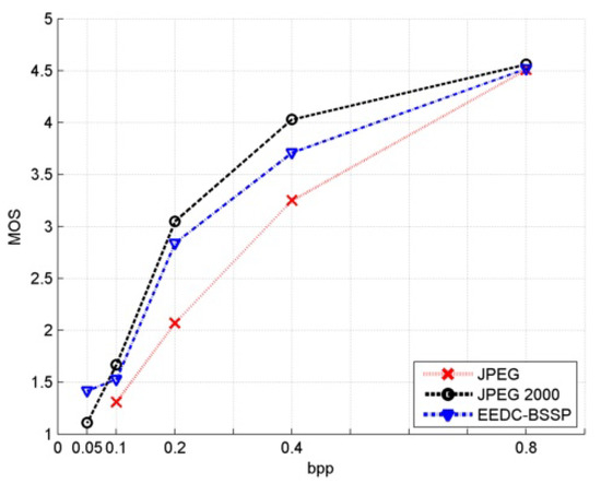 MOS values comparison for EEDC-BSSP with JPEG and JPEG 2000 for image pills.