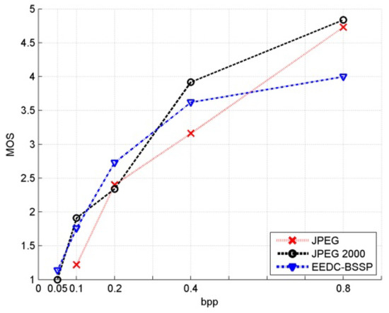 As can be seen from Table 23, the competition was again between JPEG 2000 and EEDC-BSSP. EEDC-BSSP provided better results at high compression ratios and even received the best score at 0.4 bpp. At 0.8 bpp, JPEG was surprisingly rated the best. A graphical representation can be found in Figure 18.