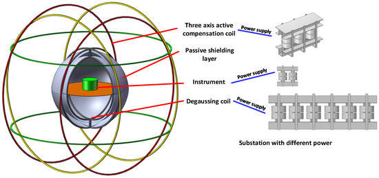 The magnetic shielding device usually consists of a passive shielding layer, an active compensation coil, and a degaussing coil. The passive shielding layer mostly uses soft magnetic materials such as permalloy to shield the magnetic field through the principle of flux diversion. The active compensation coil generates a magnetic field opposite to the Earth’s magnetic field through Biot–Savart’s law to offset the magnetic field. The degaussing coil is arranged on the passive magnetic shielding layer, the magnetic field generated by Biot–Savart’s law makes the passive magnetic shielding reach the magnetic saturation state, gradually reduces the magnetic field, and reduces the influence of factors such as the stress of the passive magnetic shielding layer during installation on the shielding performance. The experiment was carried out in the internal extremely weak magnetic field space. Common measuring instruments include SERF atomic magnetometer, SERF atomic gyroscope, electric dipole moment test system, and so on. The structure is shown in Figure 1. Due to different applications, active compensation coils, degaussing coils, and instruments need power supplies with different power requirements, among which, the active compensation coils need long-term operation and stable power supplies, the degaussing coils need power supplies with high power and fast response, and the instruments need less power. Therefore, magnetic field analysis is conducted for 323 kW (active compensation coil), 1630 kW (degaussing coil), and 9 kW (instrument) substations according to different power demands.