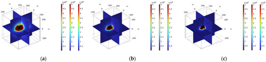 Simulation results of substation environmental magnetic field (the color scale on the right side of the figure represents the magnetic induction intensity). (a) Substation 1 (323 kW); (b) substation 2 (1630 kW); (c) substation 3 (9 kW).