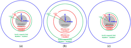 Influence range of substation environmental magnetic field. (a) Substation 1; (b) substation 2; (c) substation 3.