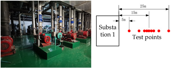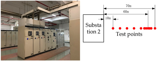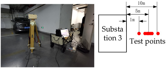 Substation 3 is designed to provide power together inside the magnetic shielding device. The working state of the tested substation 2 is 9 kW. The height of the measuring support from the ground is 1.1 m. The site photos are shown in Figure 13.