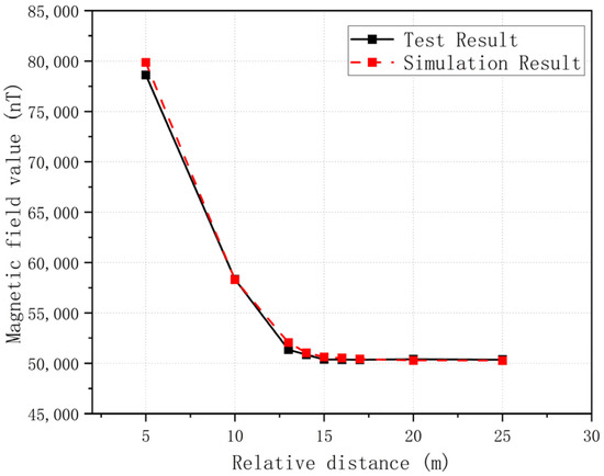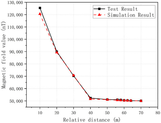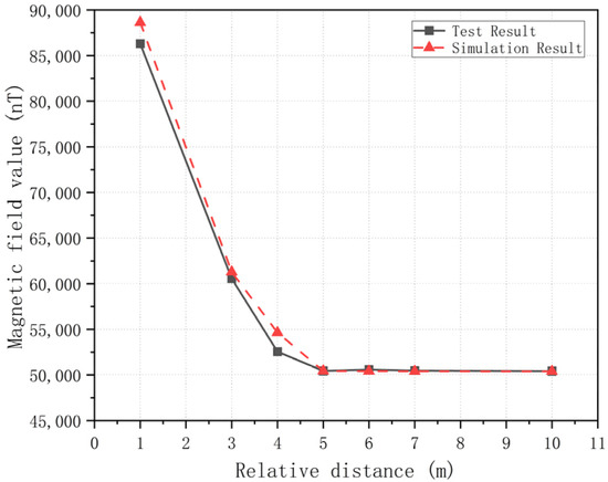 According to the test results, substation 1 at test point 1 has a large impact on the DC magnetic field, which is about 1.6 times that of the Earth’s magnetic field. When the distance between the test point and the substation increases, the magnetic field gradually decreases, and at about 15 m (point 5), decays to the Earth’s magnetic field level. In the simulation calculation, the geomagnetic field value obtained from the actual test is added through the “background field” function of the finite element simulation software, and the test results are similar to the simulation results.