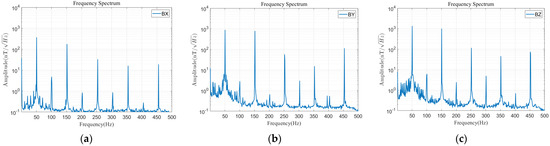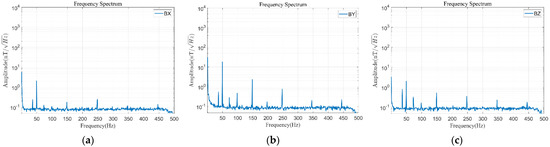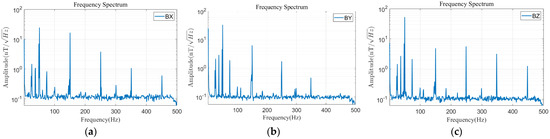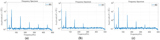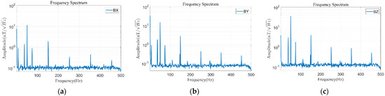 Similarly, in order to obtain the magnetic field contribution of each frequency band, the Mag-03 fluxgate is used to collect and record the real magnetic field before filtering (the sampling frequency is 1000 Hz), and the spectrum diagram is drawn. Figure 15 shows the spectrum analysis diagrams of the east–west, north–south, and vertical to the ground magnetic fields of test point 2.
