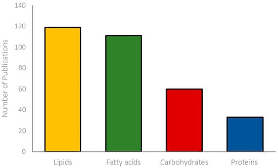 The number of publications (2000–2023) referring to the concentrations of lipids, fatty acids, carbohydrates, and proteins in freshwater cyanobacteria.