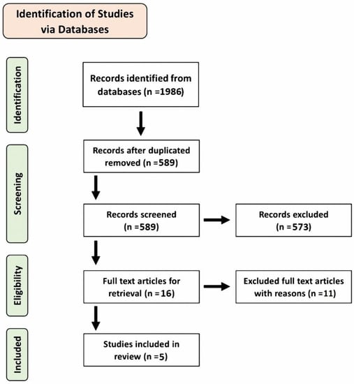 Illustration of the review process based on the preferred reporting items for systematic reviews and meta-analyses (PRISMA). As the Figure shows, overall, 1986 studies were included, and after removing the duplicate studies, 589 remained. At this stage, all the irrelevant studies were removed as these studies did not consider adult subjects with good general health or did not consider the intended clinical parameters, and 16 articles were selected for retrieval. From these articles, 11 articles were excluded because they followed up on the treatment outcomes for less than two years, and the number of implants reviewed was less than 20. Therefore, 5 studies were selected for this systemic review.