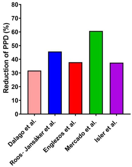 Reduction of PPD values after follow-up (i.e., after surgical treatment) compared to that of the baseline, reported by Dalago et al. [], Roos-Jansåker et al. [], Englezos et al. [], Mercado et al. [], and Isler et al. []. As these studies showed, the highest and lowest reductions were observed in the Dalago et al. and Mercado et al. studies, respectively.