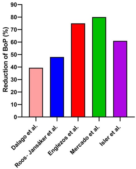 BoP showed a significant reduction in all studies by ~86.1%, 80%, ~39.4%, 75%, and 60.9% in the Roos-Jansåker et al. [], Mercado et al. [], Dalago et al. [], Englezos et al. [], and Isler et al. [] studies, respectively (Figure 3). In the Dalago et al. study [], BoP at the final period of review, compared to that of baseline, decreased by 72.2%, 26.1%, and ~20% in groups 1, 2, and 3, respectively. The highest reduction in BoP was observed in the Roos-Jansåker et al. [] study, in which bone substitute material and a resorbable membrane were used as a therapeutic approach. The results of the Mercado et al. study [] demonstrated that while 100% of the treated implants had BoP at the baseline, this value decreased to 20% at years two and three after surgical treatment. Also, in the Englezos et al. study [], all implants showed BoP at baseline; however, two years after surgical intervention only 10 of 40 implants (25%) demonstrated BoP. Moreover, the results of Isler et al. study [] demonstrated that the application of a xenogenic bone grafting material with CGF or CM was efficient in treating peri-implantitis, where using these materials could decrease BoP values compared to the baseline by 66.35% and 60.9% at one and three years after surgical therapy, respectively; however, using the bone substitute + CM (group 2) was found to be more efficient, compared to the bone substitute + CGF (group 1), in decreasing the BoP values, in which the BoP values for group 1 decreased by 63.4% and 58.4%, at year one and year three after surgical treatment, respectively, while these values for group 2 were 69.3% and 63.4%, respectively.