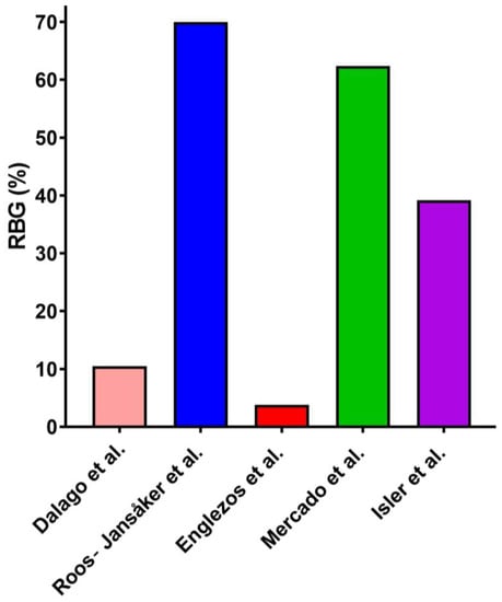 Radiographic bone gain (RBG) values after follow-up (i.e., after surgical treatment) compared to that of the baseline (before surgical treatment), reported by Dalago et al. [], Roos-Jansåker et al. [], Englezos et al. [], Mercado et al. [], and Isler et al. []. As these studies showed, the highest and lowest RBG values were observed in the Roos-Jansåker et al. and Englezos et al. studies, respectively.