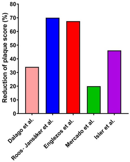 Reduction of plaque score values after follow-up (i.e., after surgical treatment) compared to that of the baseline (before surgical treatment), reported by Dalago et al. [], Roos-Jansåker et al. [], Englezos et al. [], Mercado et al. [], and Isler et al. []. As these studies showed, the highest and lowest reductions were observed in the Roos-Jansåker et al. and Mercado et al. studies, respectively.