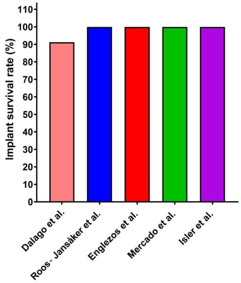 The results of the Roos-Jansåker et al. study [], the Mercado et al. study [], the Englezos et al. study [], and the Isler et al. study [] demonstrated that no implants were lost during the five, three, two, and three years after treatment, respectively. In addition, in the Dalago et al. study [], the overall implant survival rate was found to be 91.30% during three-year follow-up, in which 88.89%, 83.33%, and 100% of implants in groups 1, 2, and 3, respectively, were functioning during this time (Figure 6).