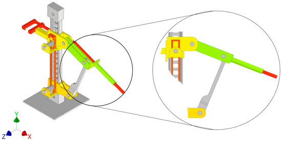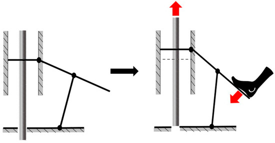 The operating mechanism of the extraction device presented in this study is shown in Figure 2. When the user exerts pedal effort on this device, the force converted into vertical force by the link structure is transmitted to the gripper holding the agricultural pipe. It is a device that uses the principle that the pipe embedded in the farmland is lifted and removed by the force. This allows users to quickly and easily remove agricultural pipes by simply pedaling with their feet.