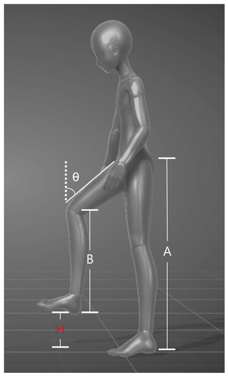 Assuming that the extraction device is operated, Figure 6 shows the height of the anterior iliac spine (A), height of the tibiale (B), and height from the ground to the sole of the foot (H). The figure corresponds to the case when the leg is lifted, and the knee is bent at a certain angle (θ). The constraints of the objective function are selected based on the average anthropometric data of Koreans aged 40 to 69 years and the value of the initial knee joint angle. To this end, the height (H) from the ground to the sole of the foot is calculated, as shown in Equation (6).