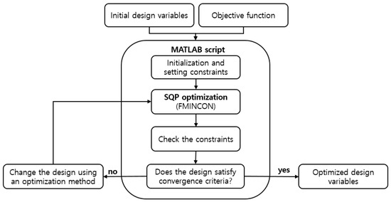 Here, d is the search direction vector, k is the number of iterations, H is the Hessian matrix, is the objective function, and is the constraint expression. The initial value of the design variable and the initial matrix of the Hessian matrix are obtained. After obtaining the search direction vector, a new is selected through Equation (6). This process is repeated, and when the optimal design variable is found, the algorithm is terminated (Cha et al., 2013) [10].