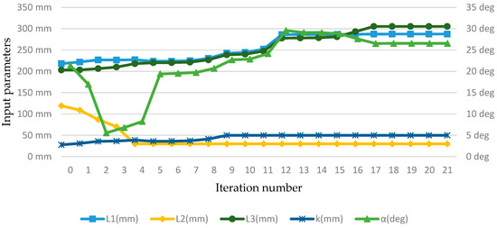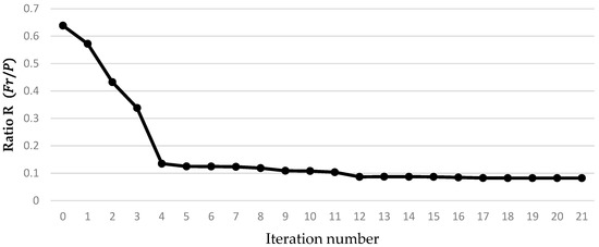 During the optimization, the value of for P converged after 21 iterations. The process of optimizing the ratio R using the SQP algorithm is shown in Figure 8, and the process of optimizing each design variable is shown in Figure 9. From Figure 8, it can be seen that the ratio R has an extremely large value in the first three iterations but converges stably thereafter. However, as shown in Figure 9, all parameters selected for the optimization converged after the 17th iteration. Thus, the optimization process was interrupted after the 21st iteration.