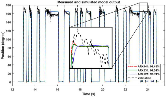 The ARX’s structure can be determined by zeros, poles, and delay values. Different structural configurations produce different results and have a significant impact on the mathematical model’s performance. ARX is represented as na − nb − nk, where na represents polynomial A order, nb represents polynomial B + 1 order, and nk represents the delay of input–output. In each system, the order can be different. Lower-order structures are commonly used because higher-order structures produce more unstable outputs and add complexity to the model.