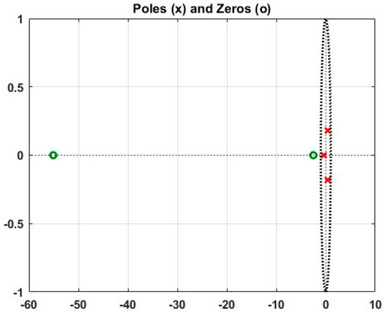 ARX221, ARX331, and ARX441 were the three ARX models obtained with different set of orders. To obtain the best fit percentage, the ARX models were validated using validation data. According to the observations, the fourth-order model ARX441 provided the best fit with a value of 94.45%, as illustrated in Figure 5. This demonstrates the mathematical model’s ability to represent the FBBA actual plant. Although ARX441 provided the best fit, ARX331 was selected with a best fit of 94.34%. This is due to the fact that higher order is more complex, and the difference in best fit between ARX331 and ARX441 was minimal. As a result, ARX331 was chosen to portray the FBBA real plant. Equation (7) depicts the transfer feature of the FBBA. Because all of the poles were within the unit circle, as shown in Figure 6, the system was considered stable.