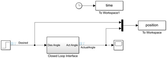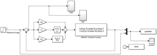 Simulink was used to test the PID-GA parameters in the simulation. The block diagram used to simulate the system is shown in Figure 9. The ARX331 transfer function obtained during the system identification process is designed to mimic the FBBA real plant. A 100-degree step source was used as the reference angle, and the controller’s performance was measured in terms of overshoot (OS %), rise time (Tr), and settling time (Ts). The simulations were run with a sampling time of 0.005 s.