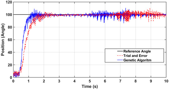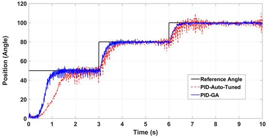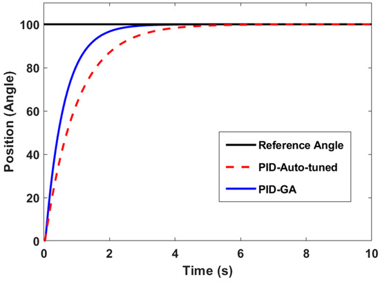 Figure 10 compares the simulated closed-loop step response of the PID-auto-tuned and PID-GA performance. A reference angle with a constant value of 100 degrees was set as the desired position. From the result, PID-GA shows a better overall performance when compared to PID-auto-tuned.