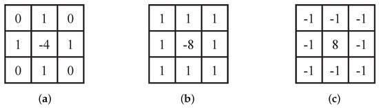 Common Laplace filter templates: (a) filter for Formula (2), (b) diagonal expansion, and (c) practical application.