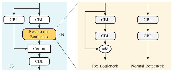 YOLOv5 contains two kinds of C3 structures, with the critical difference being whether shortcuts are present in the bottleneck structure. As shown in Figure 2, the C3 module has two branches. The first passing through a CBL module containing a convolution layer, a batch normalization layer, and an activation function. Then, N bottlenecks are calculated (where N is calculated from the parameters that control the network width, as mentioned above), and the CBL module calculates another branch. The two components are used in the concatenation operation, and a CBL module is finally used for feature fusion.