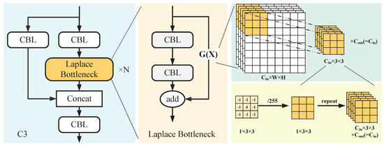 By visualizing the output tensors of each layer of the network, we can find a shallow feature map that contains rich details. As the number of network layers increases, the details are lost and the features become more abstract. The Laplace Bottleneck (LB) module is designed to enhance the elements of shallow features. In this study, we design the convolution kernel weight using the Laplace operator as a priori knowledge and integrate it into the residual structure of the Bottleneck to obtain the LB structure for enhancing the feature map. Specifically, we replace the original residual bottleneck module in C3 with the LB module to obtain an LB–C3 structure. The structure of the LB-C3 module is shown in Figure 3.