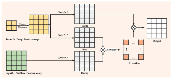 where Q, K, V , and W, W, W are the respective weight tensors of the three 1 × 1 convolutions. Then, we reshape Q, K, V and obtain the output Z according to the Formula (6). We use the attention mechanism to help the deep network obtain the shallow feature information. The shallow feature map with small target details guides the up-sampling of the deep feature map, allowing the network to selectively adjust its attention and obtain the details of small targets.