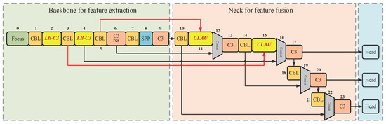We propose LB to enhance the details of the shallow features in the feature extraction stage and CLAU in the neck to improve the feature fusion capability of the network. Further, we combine the two modules as shown in Figure 5. For the sake of illustration, we have numbered each network layer. There are two LC–C3 modules, placed in the network’s second and fourth layers, and the network’s eleventh and fifteenth layers are CLAU models. The input of layer 11 is the preceding layer (layer 10) and the detail-enhanced layer 5. We set layer 5 as the guiding layer to provide detailed information for the deep network and use the attention mechanism to guide the network to extract more small target features, then splice these with the characteristics of layer 6 in the channel dimension. Finally, convolution is used for feature fusion. The structure of layer 15 is similar to that of layer 11, and its input is the output of layer 3 and layer 14.
