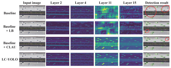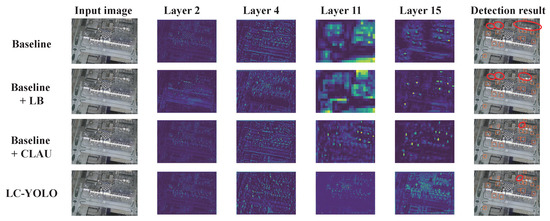 We performed ablation experiments on the UCAS-AOD dataset to verify the effectiveness of our LB and CLAU modules. The output feature maps of each network layer were visualized, with the results shown in Figure 7 and Figure 8. When detecting vehicle and aircraft samples, both the LB module and CLAU module demonstrate improvements in network performance. According to the optimization scheme presented in Figure 5, when only the LB module was used to optimize the basic network it was able to enhance the detailed features extracted from the shallow layer of the network. Specifically, the second line of the feature maps shows that the contour of the small targets in the second and fourth layer of the network feature map is enhanced (indicated by brighter colors). On the other hand, with only the CLAU module used to optimize the baseline, the location information of small targets appears in the eleventh and fifteenth layer network outputs of the third line, indicating that the CLAU module supplements detailed information in the deep network. With both the LB module and CLAU module used for optimization simultaneously, the detailed features extracted by the shallow network are enhanced and the CLAU model supplements the deep network. The detection effect diagram confirms that the LC-YOLO model improves its missed detection rate for small targets.