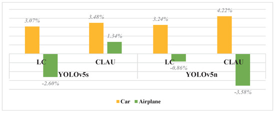 As shown in Table 3, after incorporating LB, the AP@.5 of the car samples (which are smaller) was increased by 3.07% from 87.16% to 90.32% without any additional learnable parameters; furthermore, mAP@.5 achieved a certain degree of improvement. When only CLAU was incorporated into the model, the AP of the car and airplane samples increased by 3.48% and 1.43%, respectively, with only a few parameters increased. It is worth pointing out that the AP of the smaller car samples improved more. At the same time, mAP saw a considerable improvement, from 91.66% to 94.11%. Combining LB and CLAU to obtain the lightweight LC-YOLO model resulted in a 4.66% improvement in the AP of the car samples and a 1.95% improvement in the AP of the plane samples; the mAP@.5 was 94.96%, a significant increase of 3.3%.