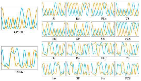 Based on this principle, we proposed four new and one combination of label-preserving transformations for modulated signals. There were three augmentation methods proposed in the existing work [], i.e., jitter, rotation, and flip, and five new augmentation methods proposed in this paper, i.e., channel shuffle, inversion, split and permutation, scaling, and flip and channel shuffle. As shown in Figure 1, we randomly selected CPSFK and QPSK from the dataset as examples to demonstrate the effect of eight augmentation transformations. A brief description of each transformation is given below.