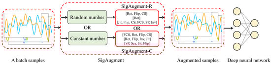 Therefore, we proposed an efficient automatic data augmentation method for radio signal data named SigAugment. The execution of SigAugment during the model training process is shown in Figure 2. For a batch of IQ samples, SigAugment selects the data augmentation sequence according to two alternative strategies provided: (1) selecting a constant number of transformations from the set of transformations and (2) selecting a random number of transformations from the set of transformations. Depending on the strategies, we named them SigAugment-C and SigAugment-R, respectively. The proposed RandAugment approach consists of two steps: