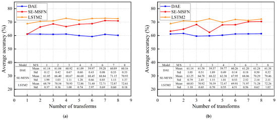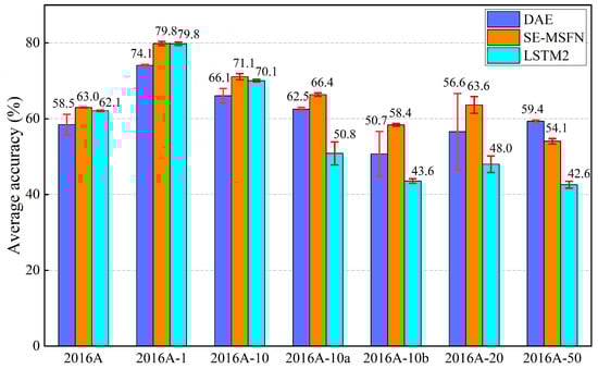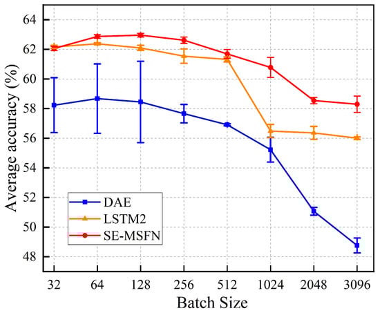 In the first set of experiments, we validated the accuracy and stability of the selected evaluation models DAE [], SE-MSFN [], and LSTM2 [] for various batch sizes, since the setting of hyperparameters has a significant impact on the training of deep learning models [,]. During our experiments, we found that the hyperparameter batch size has a significant impact on model training. The test results on the 2016A dataset are shown in Figure 3, where the vertical error bars represent the standard deviation of the three experiments, and the shorter the error bars, the better the model stability. On the balanced dataset, we can see that (1) the recognition accuracy of the three models decreases as the batch size increases; (2) the SE-MSFN recognition accuracy outperforms the LSTM2 and DAE; and (3) the SE-MSFN and LSTM2 stability outperform the lightweight model. We set the batch size of all subsequent experiments to 128 to ensure a fair comparison and to account for performance, training efficiency, and stability.