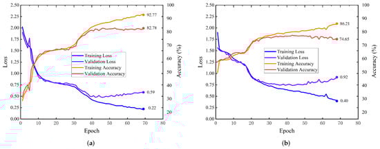 Furthermore, the greater the degree of imbalance in the dataset and the smaller the data size, the greater the gain from data augmentation. This is consistent with the expectation that smaller datasets require more regularization. Furthermore, when we compare the performance of SigAugment on the 2016A-50 dataset to the baseline model on the 2016A dataset, we find that even though the number of samples in the training set is reduced by a factor of 5 while the degree of sample imbalance increases by a factor of 5, on the same test set, our data augmentation strategies achieve recognition accuracies comparable to the baseline model (60.16% vs. 66.05%, 70.93% vs. 71.08%, and 72.61% vs. 70.06%). Figure 7 shows the loss and accuracy of LSTM2 training on the 2016A-50 dataset using the proposed SigAugment-R method. By comparing with Figure 5b, it is clear that the gap between the training loss and validation loss of LSTM2 is quite small by using SigAugment-R. This shows that SigAugment-R is effective in preventing overfitting.