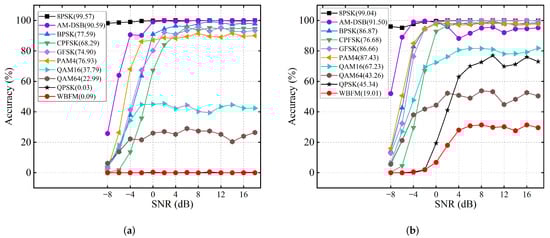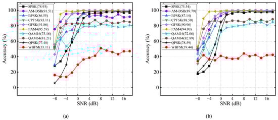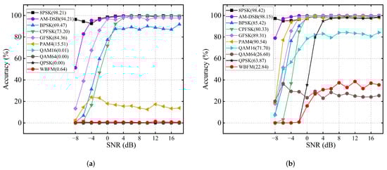 We use the average classification accuracy of all classes across all SNRs to evaluate the performance algorithm in our tests, as the distribution of classes in the test dataset is balanced. We used the average results of three independent experiments. The standard deviation is also used to measure the stability of the model. Assuming C is the number of classes and is the classification accuracy of the class in the experiment on a single model, the comparison accuracy is expressed as follows: